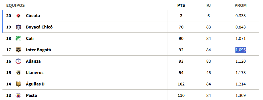 Con ese resultado, la tabla del descenso se movió de posiciones. Deportivo Cali bajó a la casilla 18, al borde de descenso directo, con un promedio de 1.071. Mientras que Internacional de Bogotá sube al puesto 17, acumulando 1.095 de promedio.