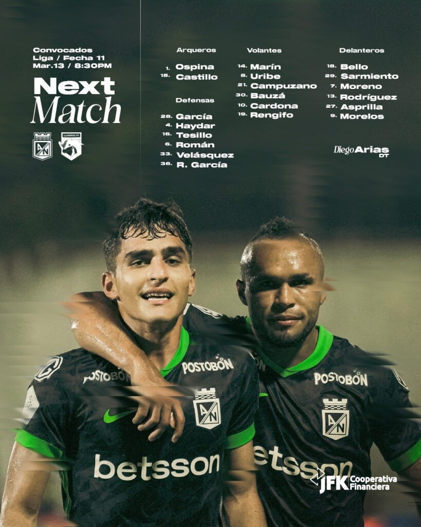 Atlético Nacional reveló su convocatoria para el partido contra Llaneros, el cual es por la fecha 11 de la Liga BetPlay 2026-1, en el Atanasio Girardot.