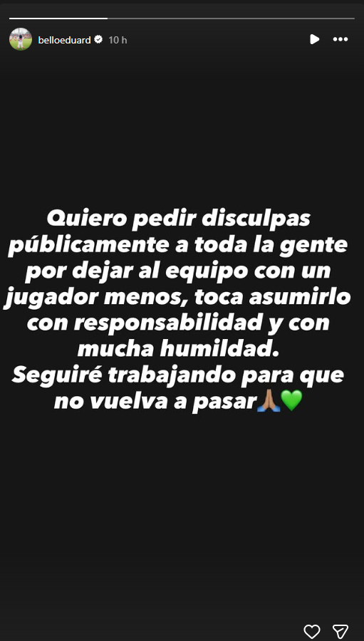 “Quiero pedir disculpas públicamente a toda la gente por dejar al equipo con un jugador menos”, son las primeras línea de su mensaje.