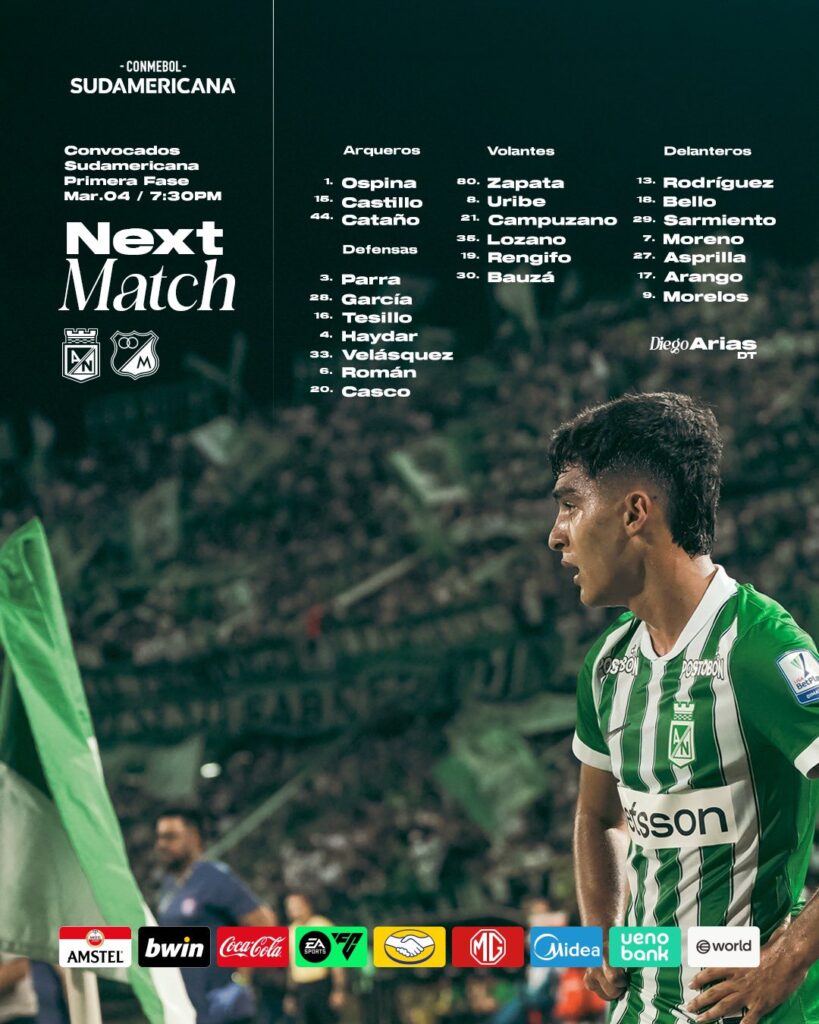 Atlético Nacional dio a conocer su convocatoria para el partido contra Millonarios, el cual es por la fase previa de la Copa Sudamericana 2026.